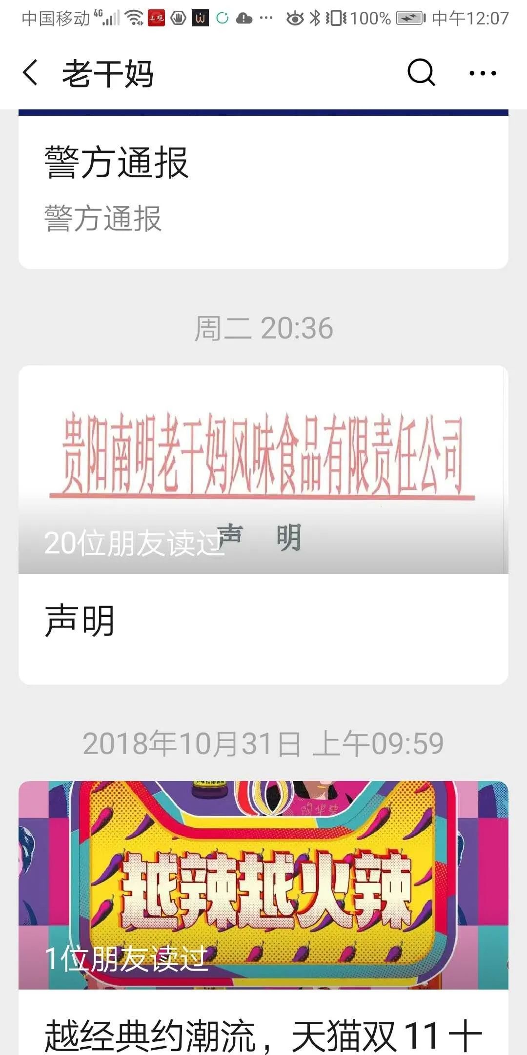 6月30日晚间,已经近两年没更新的“老干妈”公众号连夜发出公告:从未与腾讯有过商业合作,已经报警了。