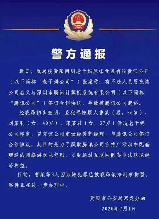 昨天,腾讯与“老干妈”之间的纠纷,在全网的“鹅”笑中,以“3人伪造老干妈印章与腾讯签订合同”的警方通报,暂时画上一个句号。