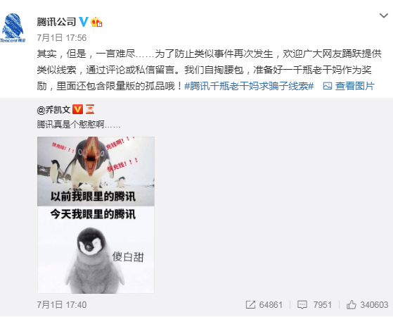 腾讯自己则回应称一言难尽,为了防止类似事件再次发生,以1000瓶“老干妈”为礼品征求类似线索。